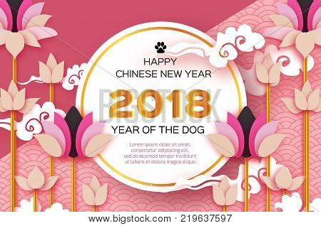 Beautiful Origami Waterlily Or Lotus Flower Happy Chinese New Year 2018 Greeting Card Year Of The Dog Text Square Frame Graceful Floral Background In Paper Cut Style Nature Cloud Blue Sky . The Event Is Celebrated By Millions Of People Around The World And Is The Most Significant Holiday In The Chinese Calendar.